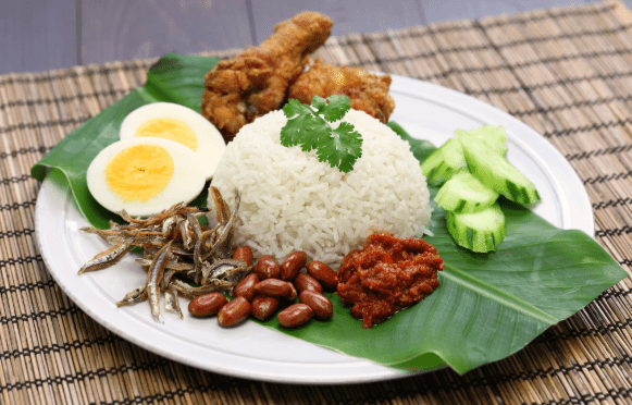 This coconut milk–based rice dish is traditionally served with sambal, anchovies, peanuts, and egg and is widely regarded as Malaysia’s national dish.
