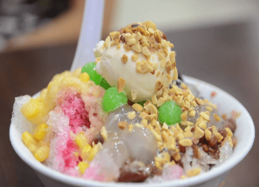 This Malaysian dessert is made of shaved ice topped with syrup, condensed milk, and sweet toppings such as cendol and red beans.