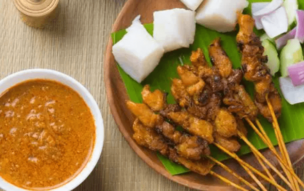 These skewered meat sticks are grilled over charcoal and served with peanut sauce.