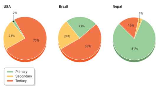 Based on the size of these countries' primary and tertiary sectors, USA is a developed economy while Brazil and Nepal are developing economies.