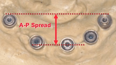 The distance measurement from the center of the most anterior implants to the distal aspect of the two most posterior implants