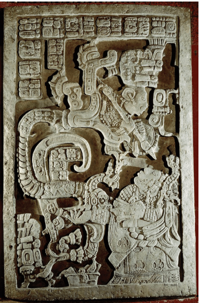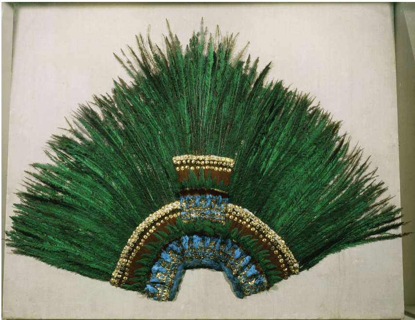This ruler's headdress is made by amanteca, craftspeople who specialized in working with this material.