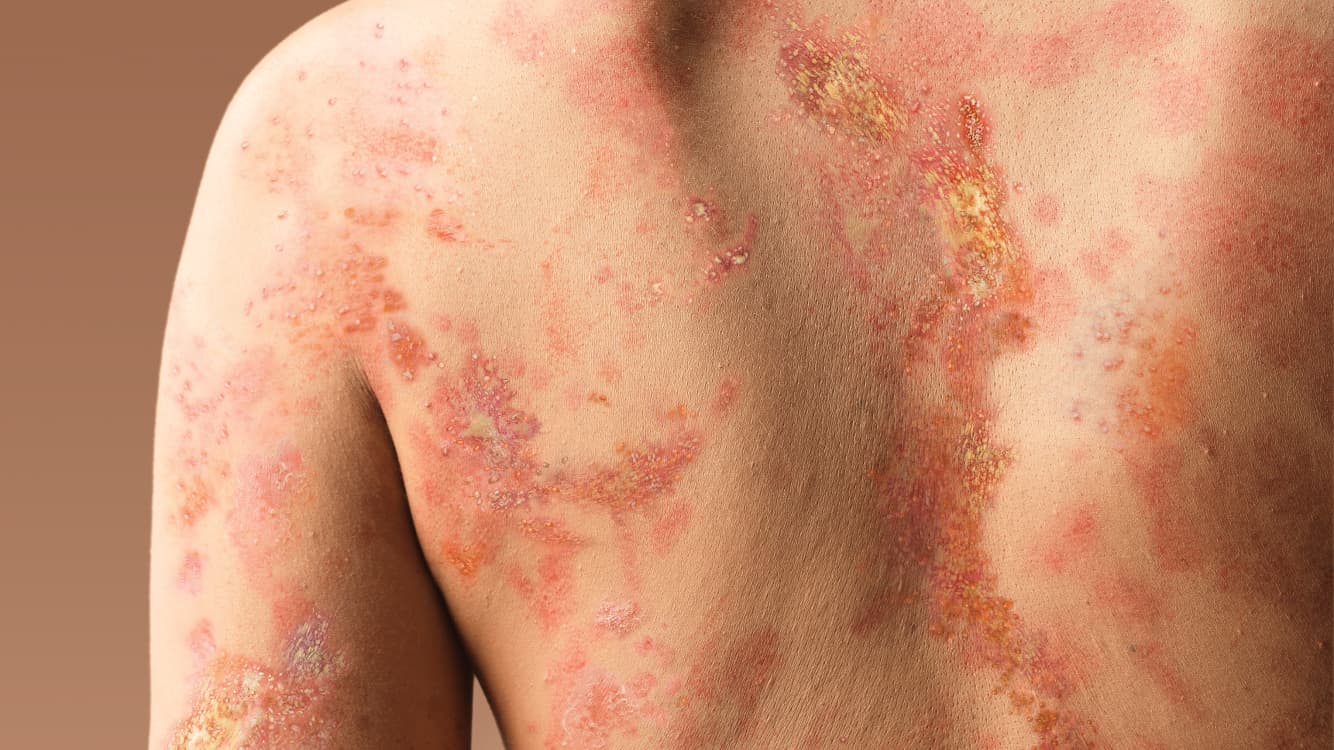 On exam, vital are normal. Skin findings on the upper torso are shown.