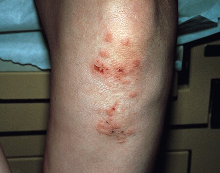 25 yo woman is evaluated for pruritic lesions on the legs and in the groin area that first appeared several months ago. The patient is otherwise in good health and takes no medications. On physical exam, vitals are normal. Skin findings are shown.