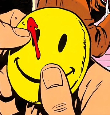 In this comic, a smiley button gets a little bloody after the death of the Comedian.