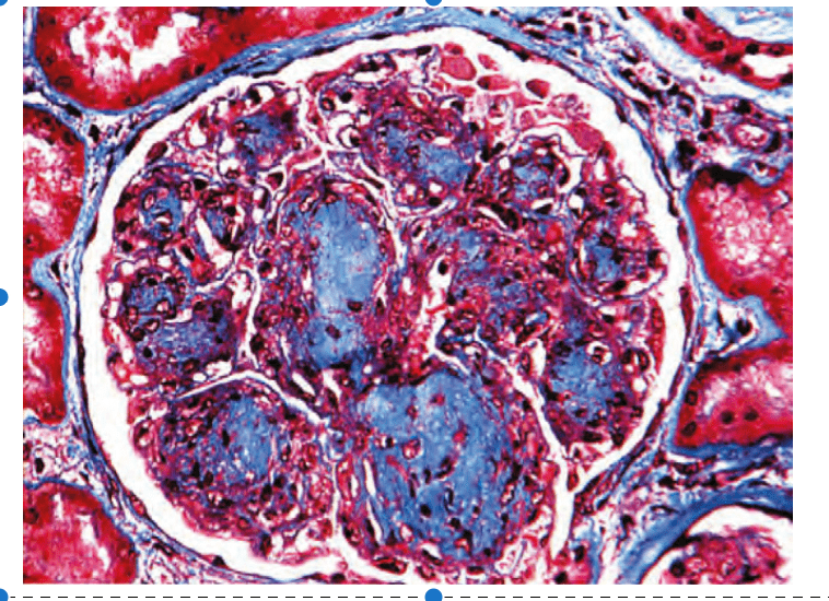 The glomerular lesion illustrated is that of nodular intercapillary glomerulosclerosis (the Kimmelstiel–Wilson lesion). Although this lesion is most often seen in patients with diabetic nephropathy, none of the choices offered have any evidence of glucose dysmetabolism. Among the choices offered, only“idiopathic” nodular glomerulosclerosis is a reasonable possibility (answer A). This newly described entity is seen most typically in older women with a strong history of excessive and long-term smoking. The lesion illustrated is not amyloidosis, sickle cell–associated membranoproliferative GN, lupus nephritis, with anti-phospholipid syndrome, or Goodpasture’s disease (answers B through E).