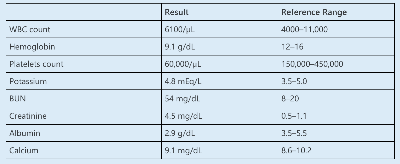 A 61-year-old woman with ESRD caused by diabetic nephropathy and congestive heart failure is seen during HD. This is her first outpatient dialysis treatment since being discharged from the hospital after treatment for pneumonia. While hospitalized, declining platelet counts were observed, and she experienced thrombosis of her arteriovenous graft, prompting suspicion for heparin-induced thrombocytopenia (HIT). She underwent successful thrombectomy. Exposure to heparin was eliminated and testing for HIT was ordered, the results of which remained pending at the time of discharge.