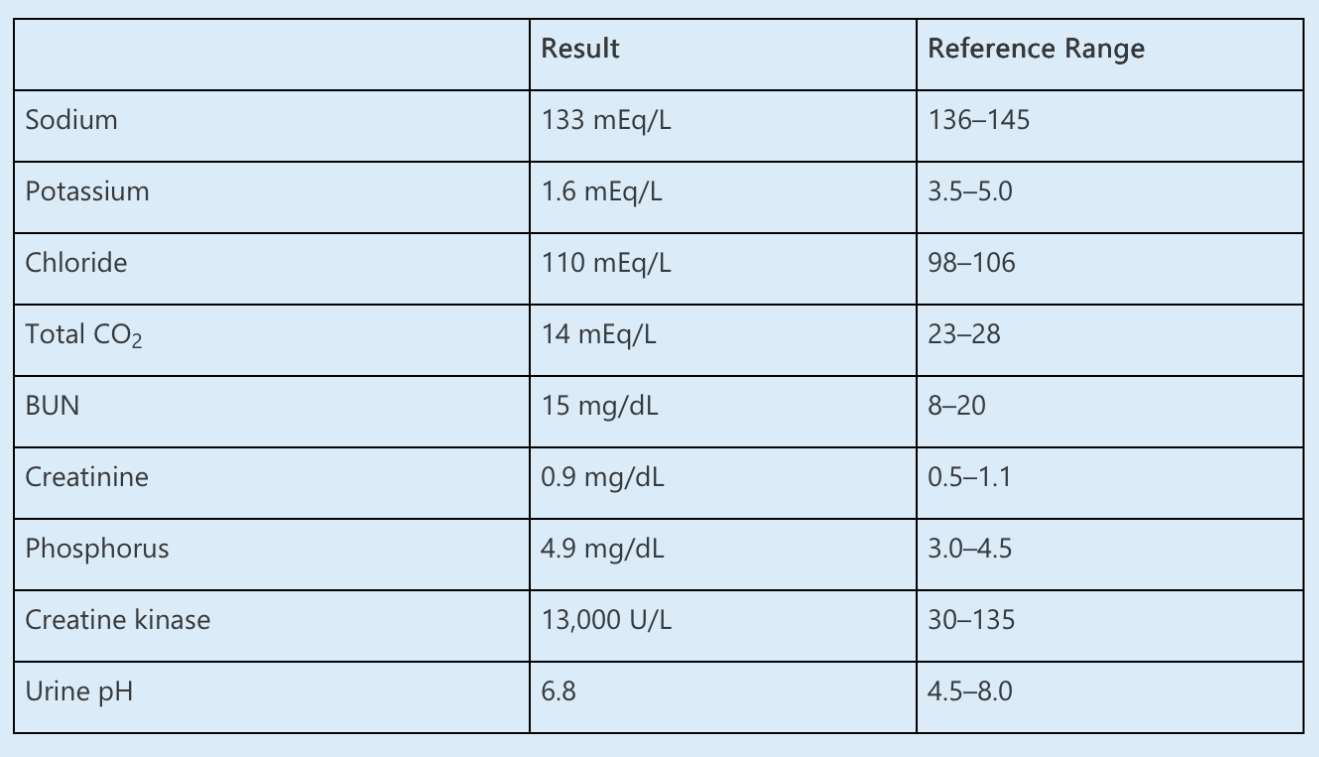 In this young patient with Sjögren syndrome, marked hypokalemia, and a non–anion gap metabolic acidosis, the most likely diagnosis is rhabdomyolysis attributable to hypokalemia induced by her distal (type 1) renal tubular acidosis (RTA).