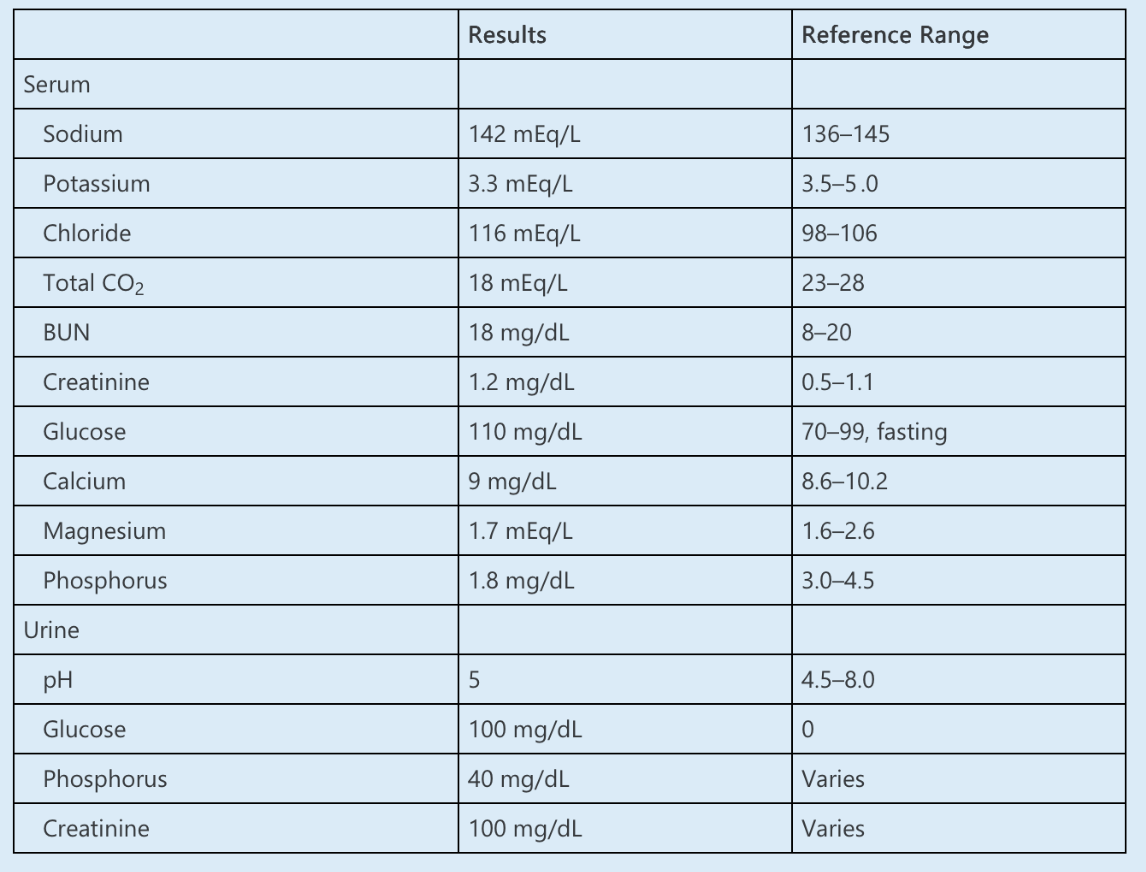 Although this patient has polyuria, polydipsia, and glucosuria, she has a random blood glucose level <200 mg/dL without symptoms, which is not consistent with a diagnosis of diabetes.