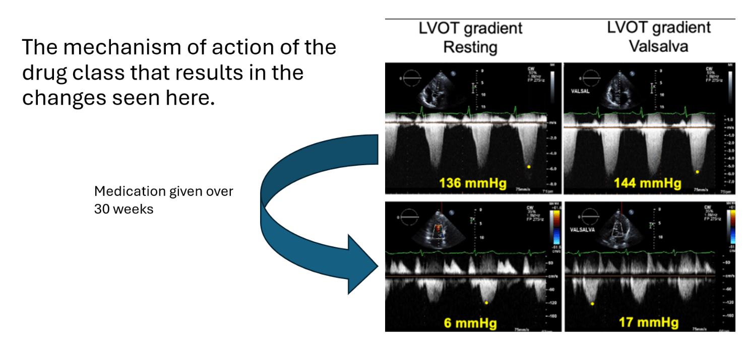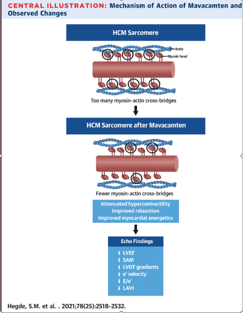 Reduces excess actin–myosin cross-bridging by decreasing myosin adenosine triphosphatase activity of the cardiac myosin heavy chain, which results in decreased sarcomere power and force generation, or decreased contractility.