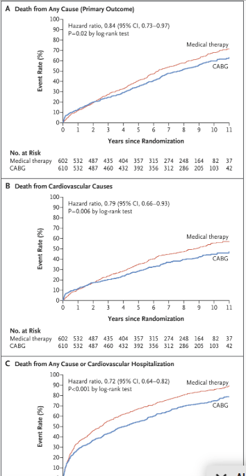 1212 patients with CAD and EF <35% randomized to CABG or Medical Therapy