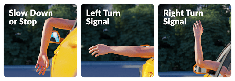 You are driving and your blinker light is out. You need to signal to the car behind you that you are going to make a left turn. What hand signal can you use?