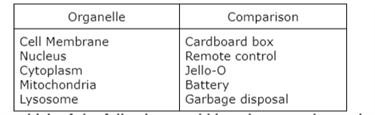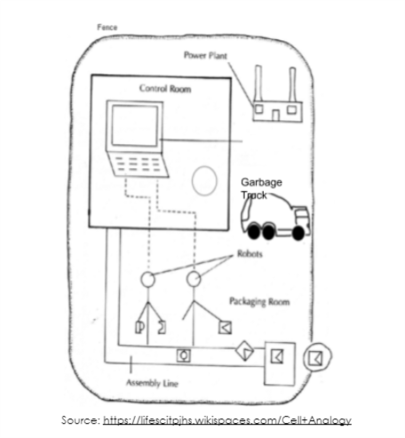 A student uses an analogy of an amusement park as a cell. In their analogy model they included the entry gate, the manager of the park, the food trucks, the wall around the park, the generator that supplies energy to the park, the janitors, and the walking paths throughout the park.