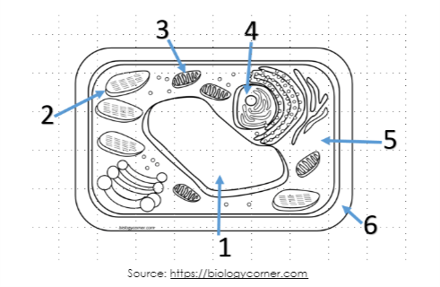 C. Organelle 3 obtains sunlight and makes sugars. Organelle 5 allows sugars to move across the cell to organelle 3. Organelle 2 breaks the sugars down into energy for the cell. Organelle 4 directs these activities within the cell giving instructions to organelle 2 and 3 to undergo these processes.