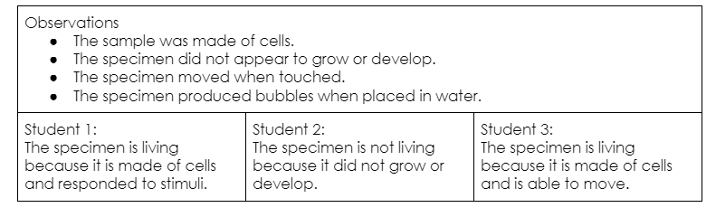 Given an unknown specimen, three students are tasked by their teacher to determine whether the specimen is living or non-living. They spent one class period making observations about the specimen and constructing their arguments from their observations.