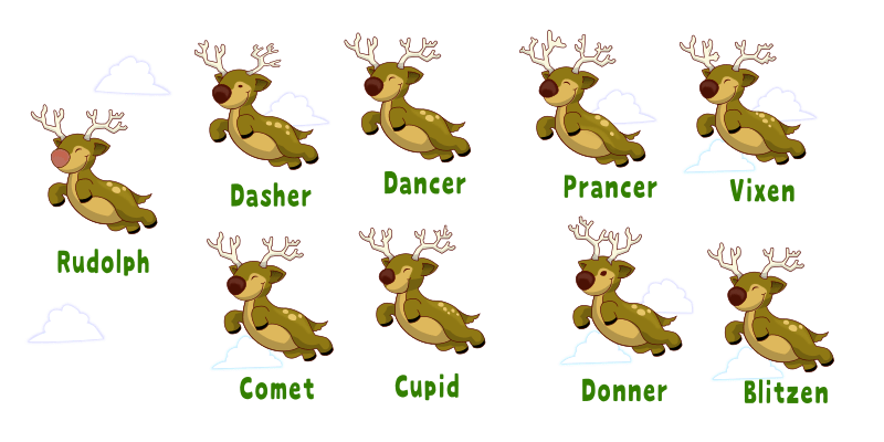 Dasher, Dancer, Prancer, Vixen, Comet, Cupid, Donner, Blitzen, AND Rudolph