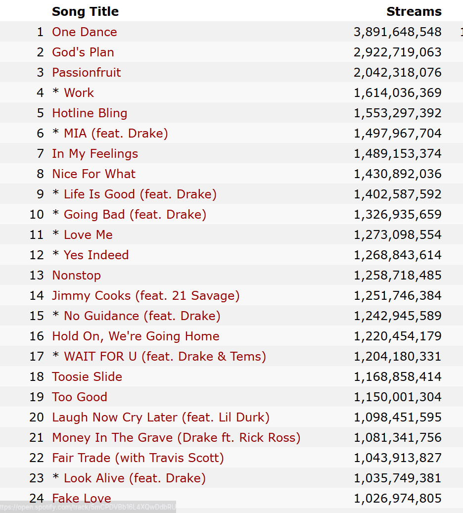Name 10 Drake songs with over 1 billion views, there are 24 songs