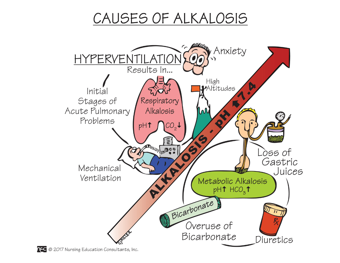 Hyperventilation causes respiratory alkalosis, because the client hyperventilates all of the CO2 off.
