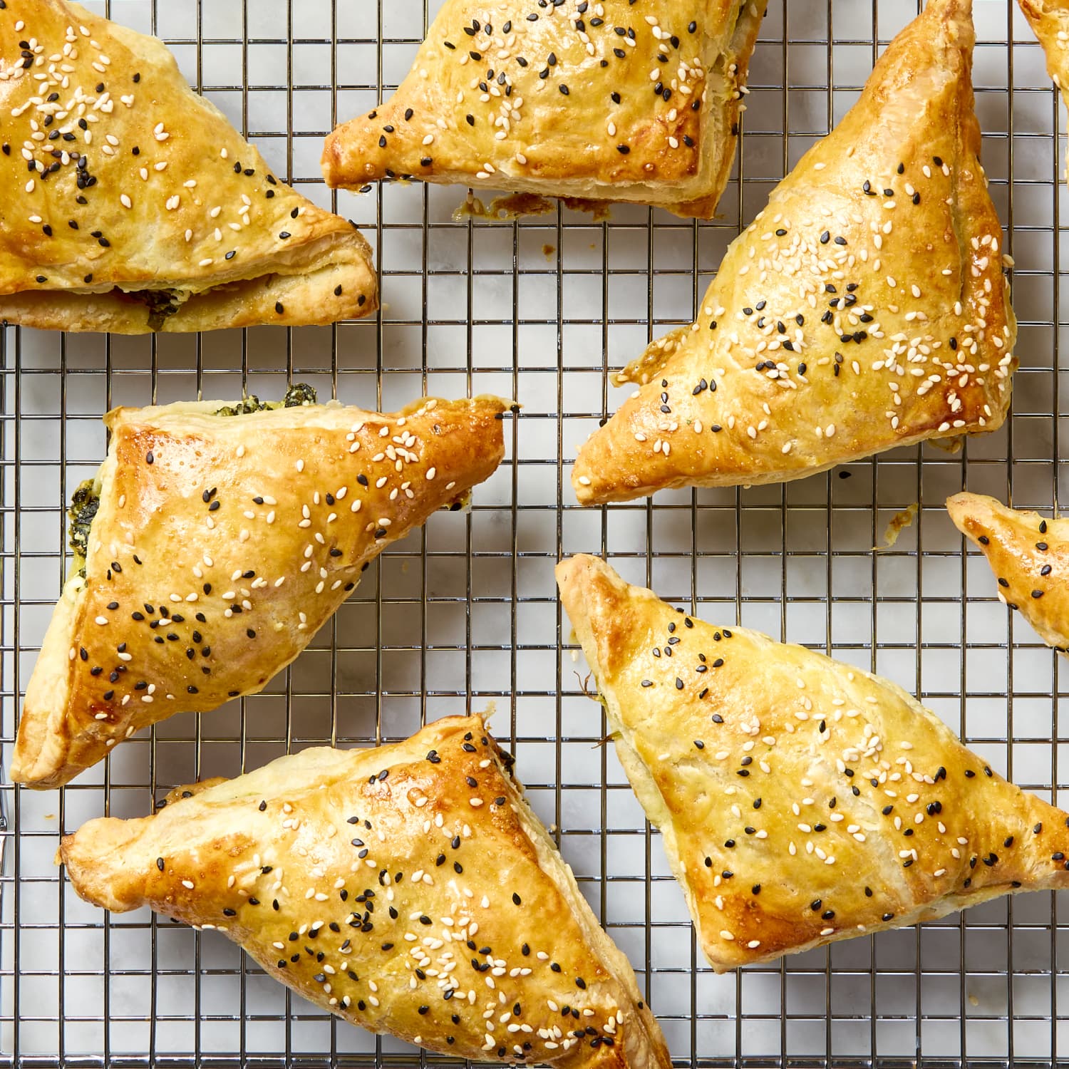 Bourekas, flaky pastries typically filled with feta cheese, are usually folded into this few-sided polygon