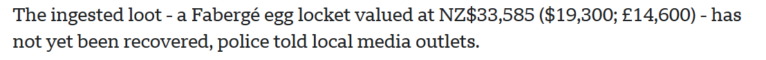 When a James Bond-inspired faberge egg went missing from a jewelry store in New Zealand, police arrested a suspect until the egg could be recovered from this hiding place.