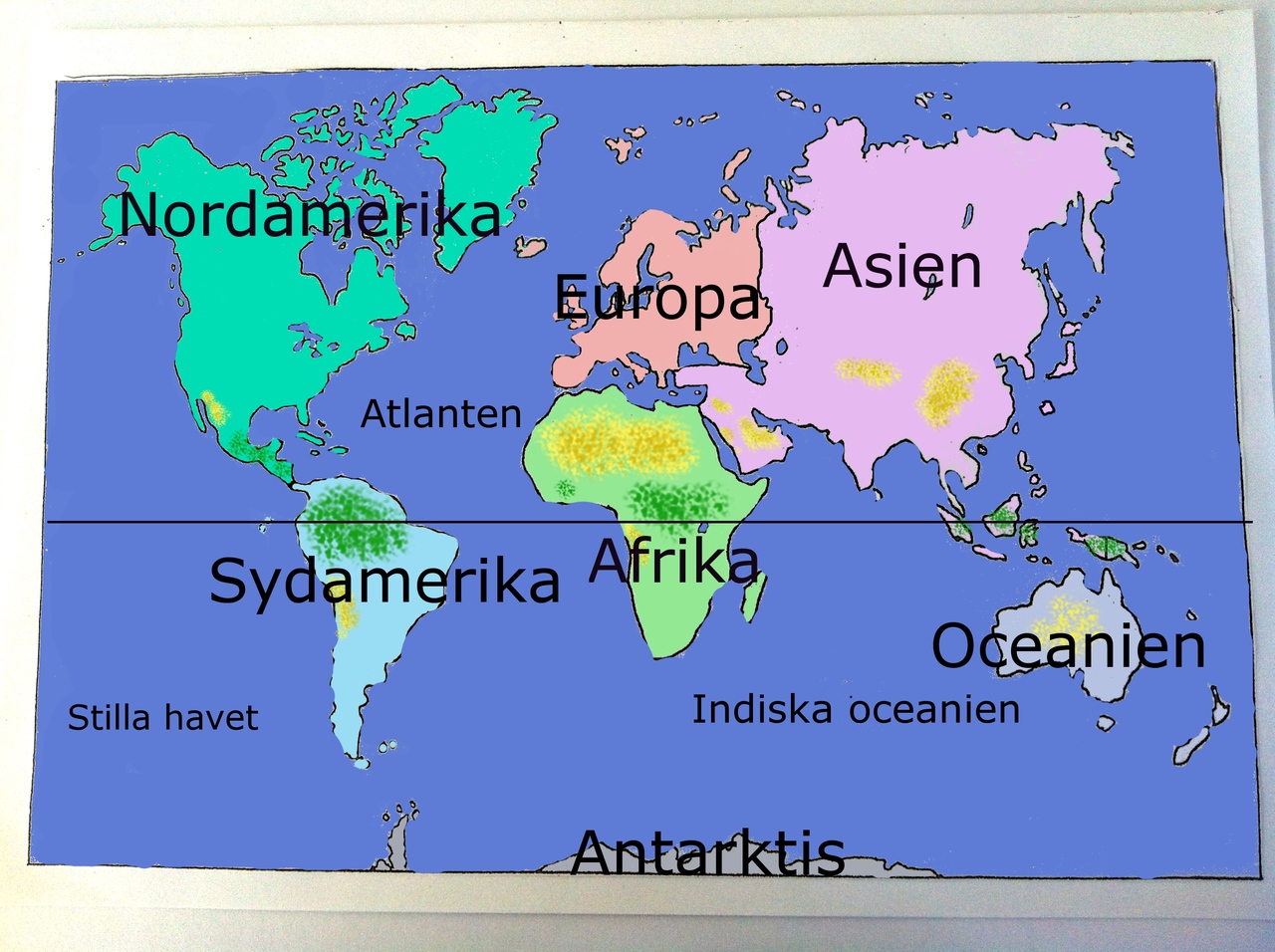 Europa, Afrika, Asien, Oceanien, Nordamerika, Sydamerika och Antarktis.