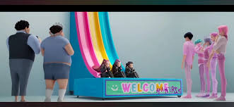 What real world KPop group signs the song "Strategy", played in the movie while the girls are in their apartment relaxing after finishing the world tour.