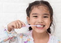 Ella se cepilla los dientes con la pasta y el cepillo de dientes.