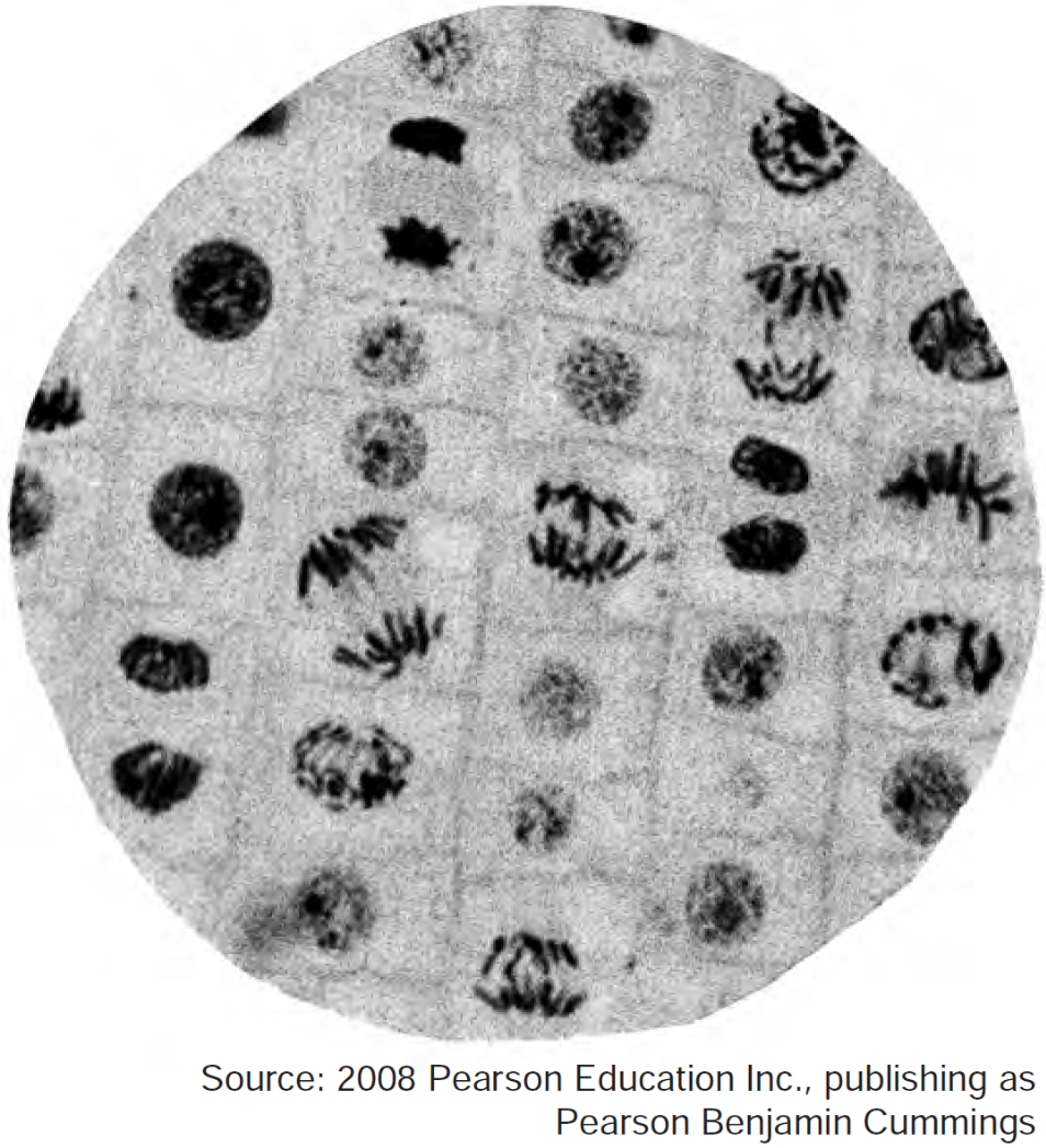 A student made a wet mount slide of living onion root cells to observe with a microscope. The diagram below represents what the student saw. When cells divide, the chromosomes become visible. As the student studied this slide, she determined that some of the root cells were dividing. Support the student's claim by drawing a diagram in the box provided below of one specific cell on the slide where mitosis is clearly occurring.