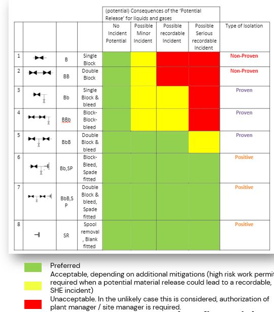 Utilice la tabla de evaluación de riesgos (LEO) y determine el tipo de aislamiento. ¿Es aceptable el tipo de bloqueo Block-Block and Bleed para un caso con un posible incidente grave registrable (Possible Serious Reportable)? ¿Qué pasa con un caso de posible incidente reportable?