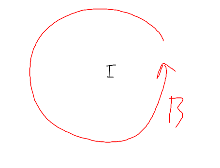 The magnetic field is given in red. In what direction is the current flowing through the point marked "I"?