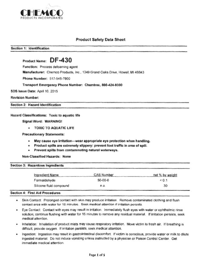 This sheet has safety & health information for chemical substances and products. It includes instructions for safe usage,  potential hazards, emergency first aid and spill-handling procedures.