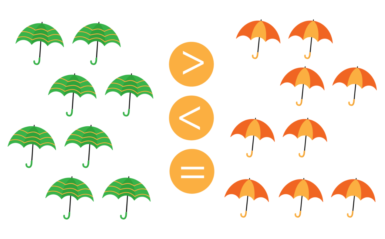 Are there ________ orange umbrellas, _______ orange umbrellas, or ________ orange and green umbrellas?