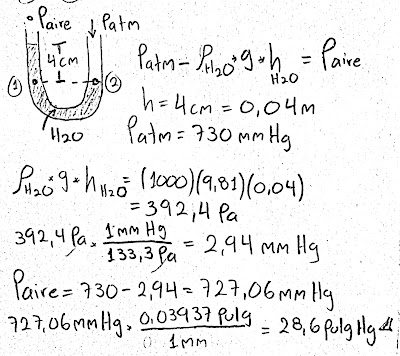 El aire fluye por un ducto sometido a una succión de 4.0 cm H2O. El barómetro indica que la presión atmosférica es de 730 mm Hg. ¿Cuál es la presión absoluta del gas en pulgadas de mercurio?