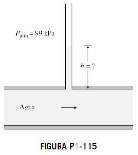 Un tubo de vidrio está conectado a un tubo de agua, como se muestra en la figura P1-115. Si la presión de agua en la parte inferior del tubo de vidrio es de 120 kPa, y la presión atmosférica es de 99 kPa, determine cuánto subirá el agua en el tubo de vidrio, en m. Tome la densidad del agua como 1.000 kg/m3.