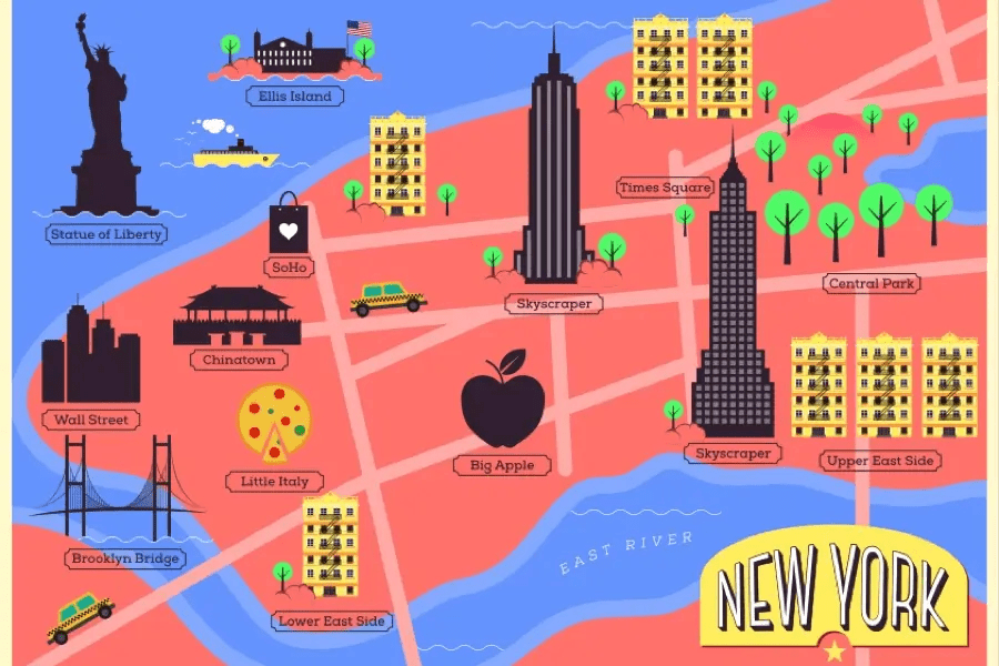 Famous sites like the Statue of Liberty that help identify locations on maps.