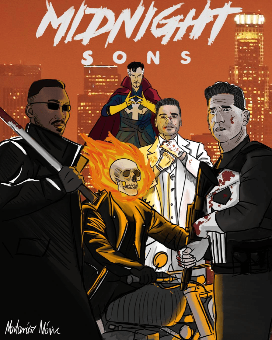 This is a marvel team consisting of Ghost Rider, Moon Knight, Doctor Strange, Punisher, Black Knight, And Blade