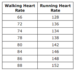 The table above displays the walking heart rate and running heart rate of eight girls in beats per minute (bpm). Using the linear best-fit model for the data, what is the predicted running heart rate of a girl whose walking heart rate is 105 bpm?