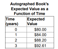 Is the autographed book's expected value a linear or exponential function of time, and why?