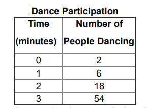 At a school dance, there were 2 people on the dance floor when the music started. After that, the number of people dancing increased as shown in the table.