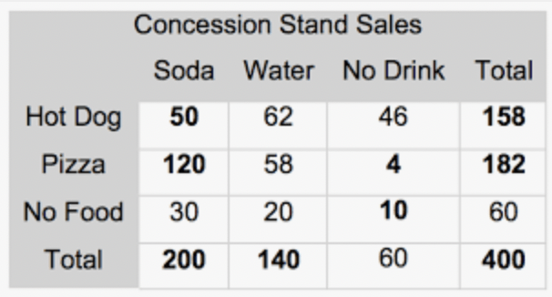 Based on the data in the table, what is the conditional probability that a person will order a soda when he orders a pizza?