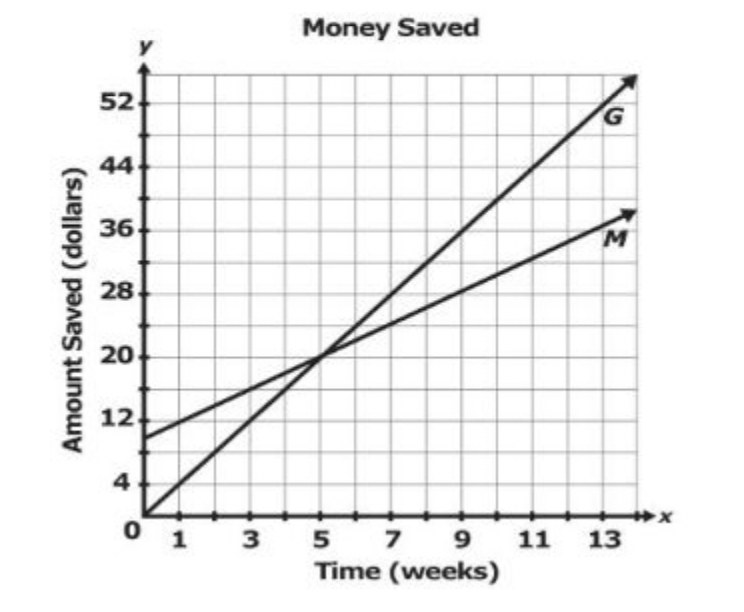 The graph shown compares the amount of money Mark (M) and Gloria (G) are saving. How many weeks after Mark started saving did Gloria have the same amount of money as Mark?