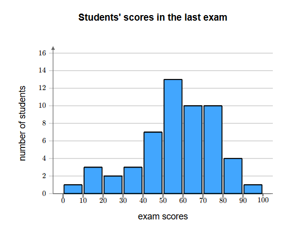A teacher wants to visualize the performance of students on a recent exam. The scores ranging from 0 to 100 were recorded in a frequency table. Use the table's data to create a histogram representing the distribution of scores. (7)