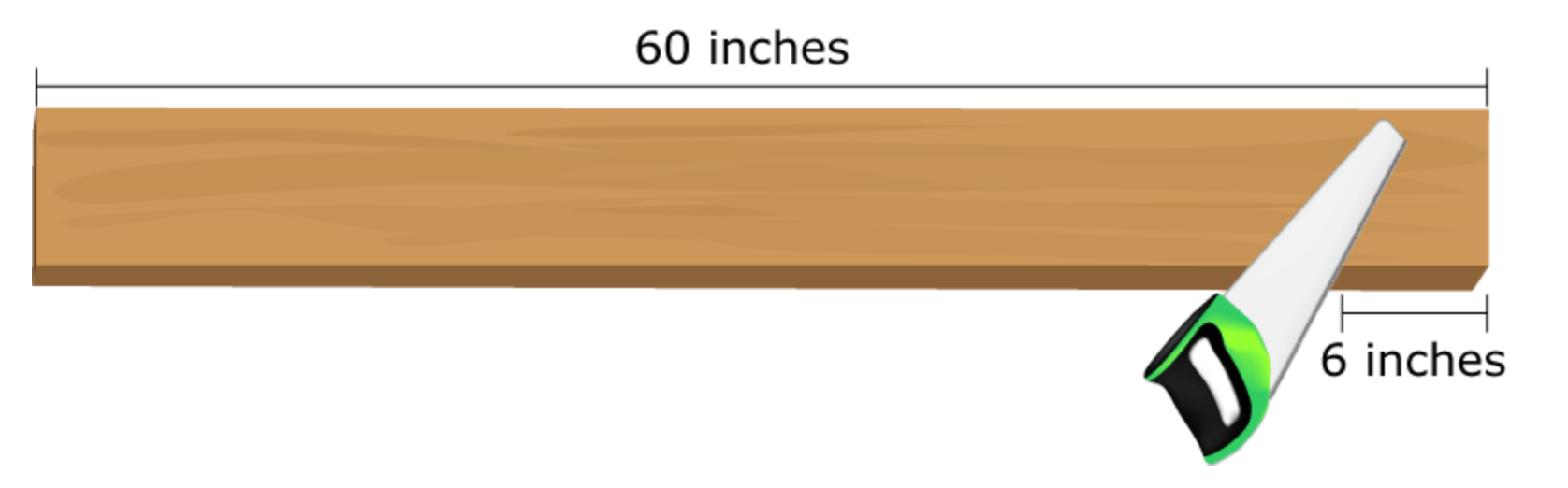 Dawnte is building a bed for his ducks. He has a board that is 60 inches long. He cuts off 6 inches. Write an equation to show how long his board is now.