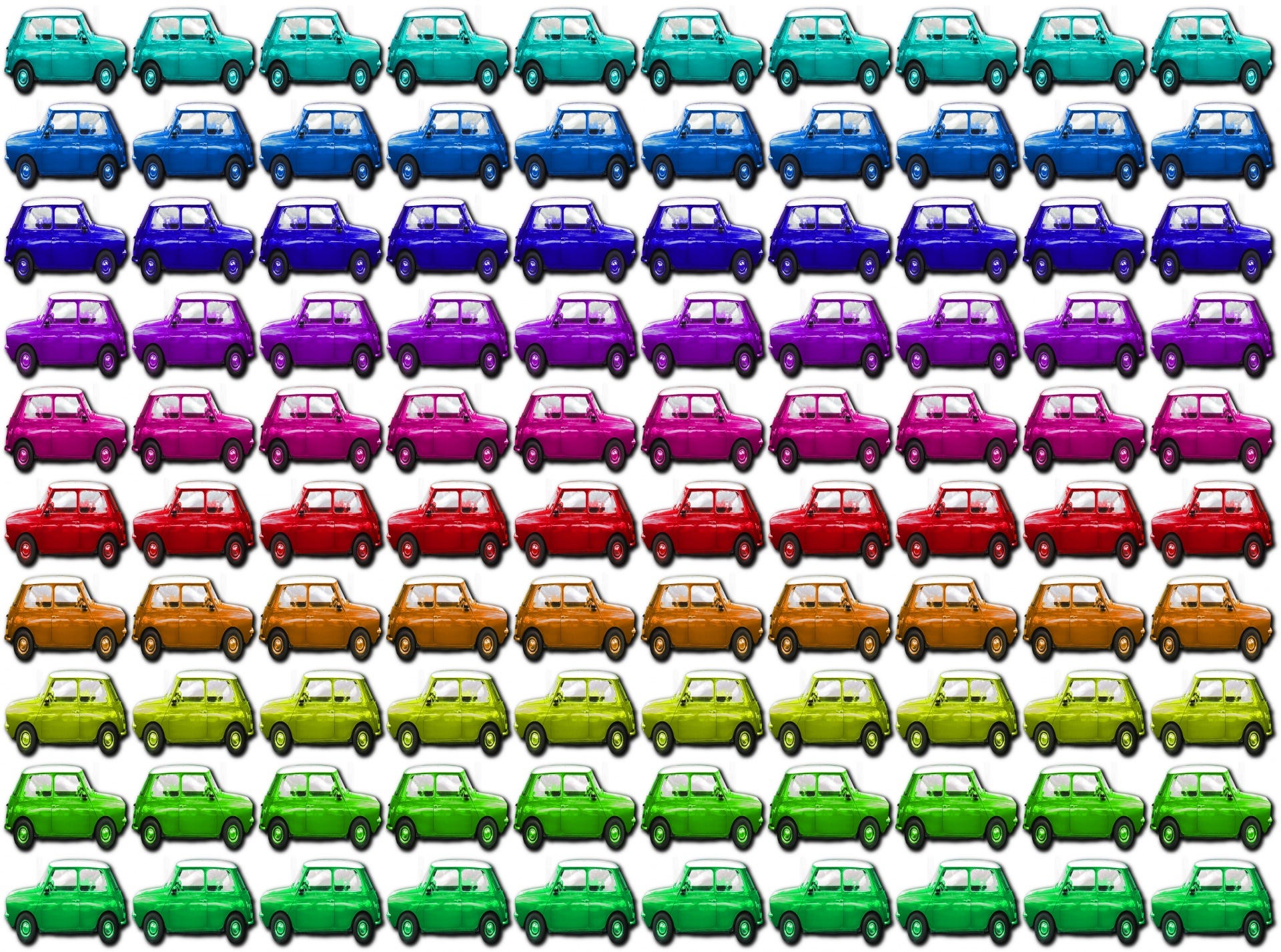 b. Some cars are the same color. Are they organized together in the same row or the same column?
