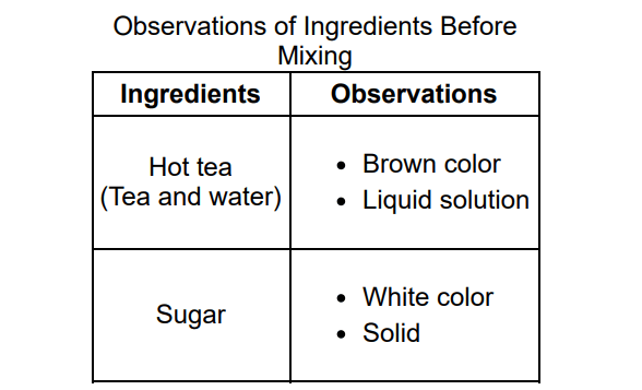 Before mixing sugar into hot tea, a student recorded the observations shown in the table.