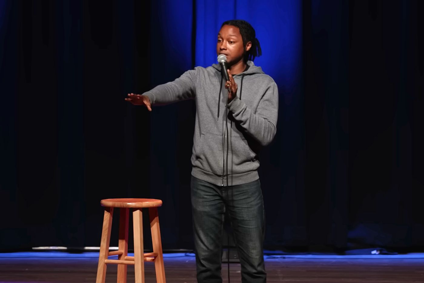 This comedian comes standard with a gray zip-up jacket and a single strand of hair pulled out.