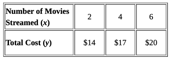 The table shows the total charge for different number of movies. Write an equation in slope-intercept form that can be used to predict the total cost y for streaming x movies in a month.