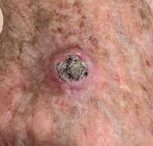 A 78-year-old woman is evaluated for a rapidly growing, painful nodule on the right dorsal hand that appeared 6 weeks ago. Medical history is unremarkable, and she takes no medications.