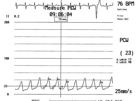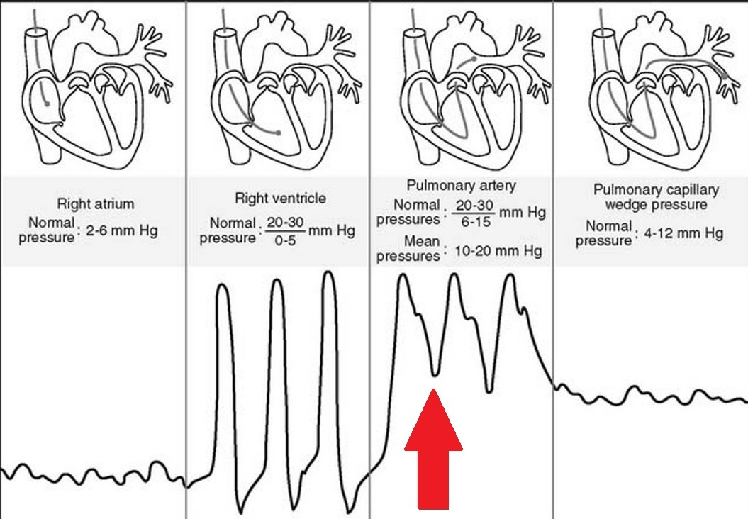 The picture below shows the transition from RV to PA waveform, signified by the event shown by the arrow and reflected in the PA pressures.