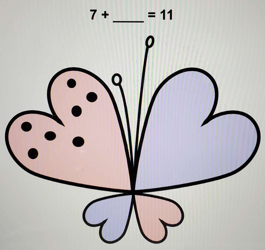 The butterfly has 7 spots on the left wing. He has 11 spots in all. Count on and say how many spots are missing.